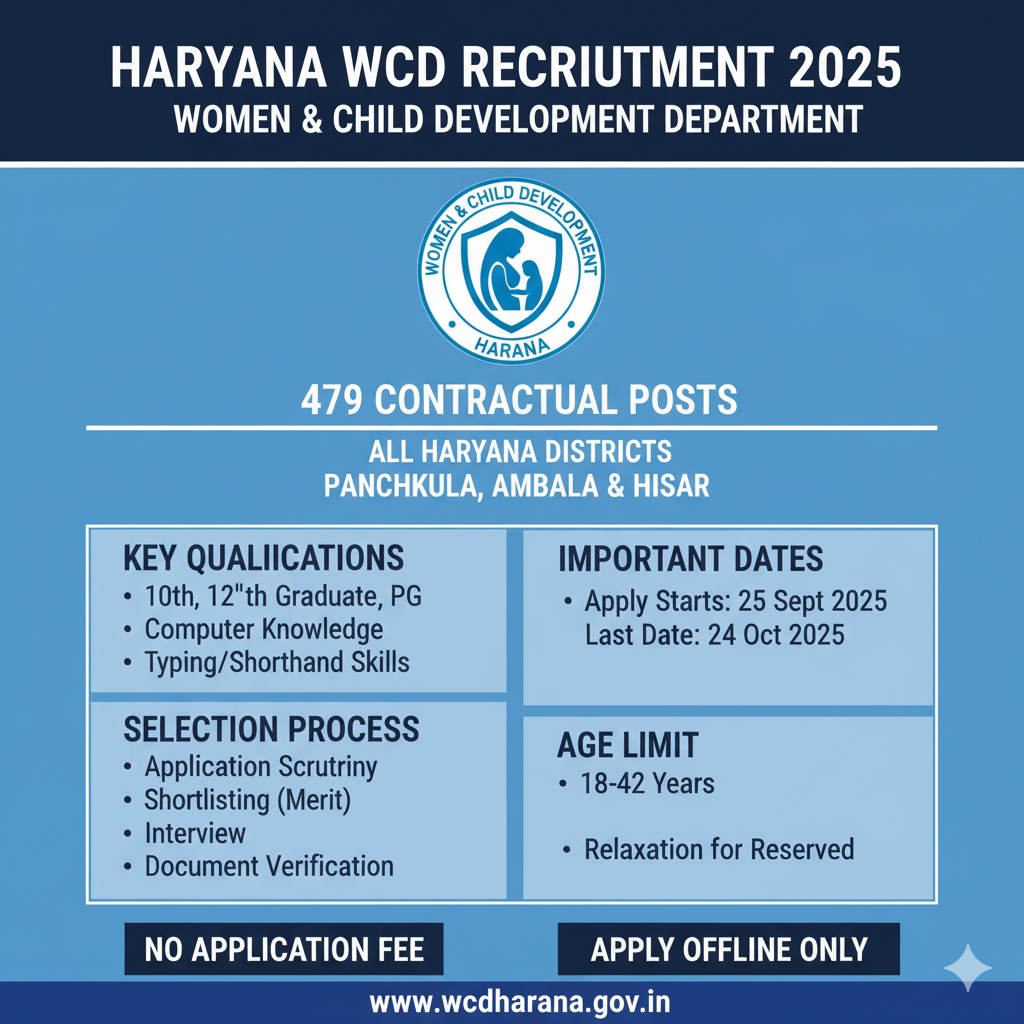 Haryana WCD Recruitment 2025: हरियाणा के Women and Child Development Department ने अलग अलग 479 पदों पर Contract basis पर भर्ती निकाली है।